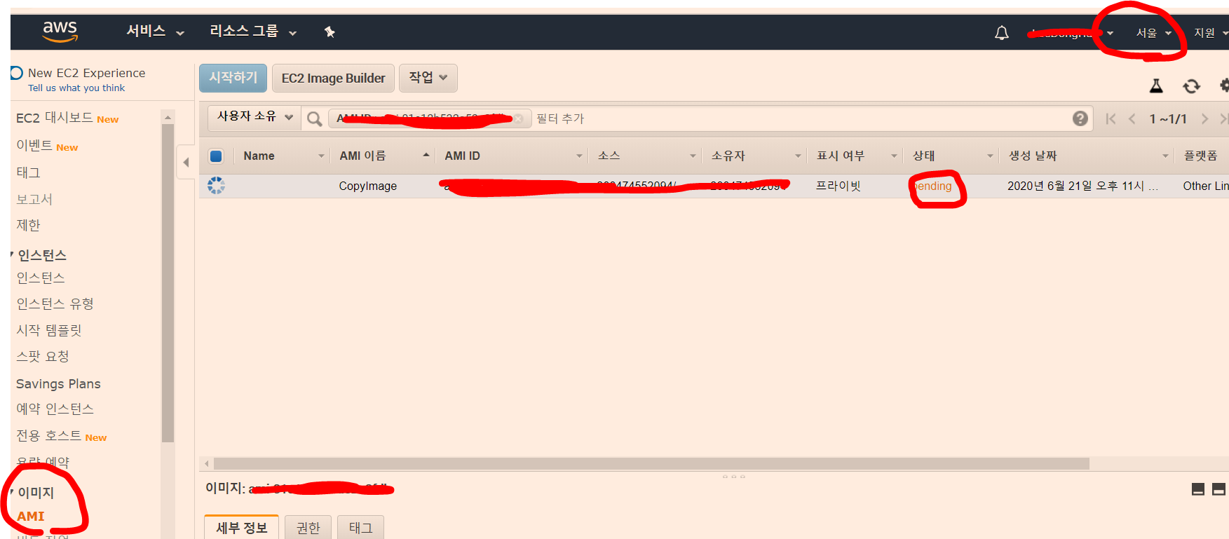 6. ์ฎ๊ธฐ๋ ค๊ณ ํ ์ง์ญ AMI ์ ๋ณต์ฌํ AMI ๊ฐ ์๋ ์์ฑ๋์ด์๋ ๊ฒ์ ํ์ธํ๋ค.
