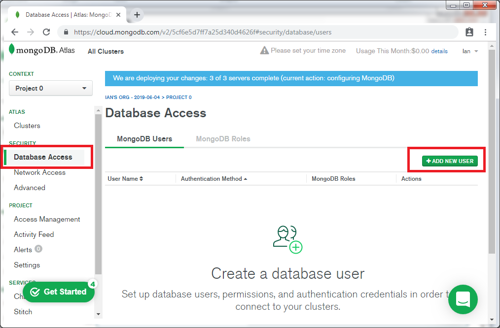 ์ผ์ชฝ Database Access ๋ฉ๋ด๋ฅผ ์ ํํ๊ณ ์ค๋ฅธ์ชฝ์ Add New User ๋ฒํผ์ ๋๋ฅด์. ์ฒ์์ ์ ๋ ฅํ email๊ณผ ๋น๋ฐ๋ฒํธ๋ mongodb.com์ ์ด์ฉํ๊ธฐ ์ํ ํ์๊ฐ์ ์ด๊ณ , ์ฌ๊ธฐ์์ user๋ DB๋ฅผ ์ฌ์ฉํ๊ธฐ ์ํ user์ ๋๋ค. ๋ณ๊ฐ์ ๊ณ์ ์ด๋ค.