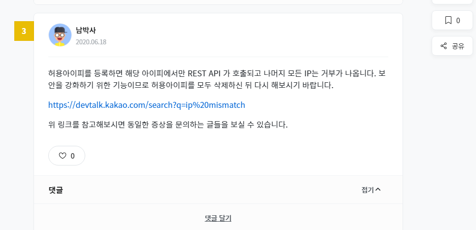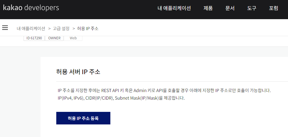 3) kakao dev์์ ํ์ฉ IP๋ฅผ ์ถ๊ฐํ ์๊ฐ๋ถํฐ, ๊ทธ IP๋ง ํ์ฉํ๋ค๋ ์นด์นด์ค์ ์ค์ ์ด ์์์. ๋ชจ๋ ์ญ์ ํ๋๋, ๋ชจ๋ IP๊ฐ ํ์ฉ๋์๊ธฐ์ ํด๊ฒฐํจ.